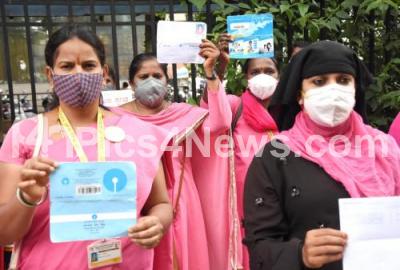 Photo Caption : Members of AIUTC Asha Workers protesting to fulfill their various demands at Kandaya Bhavan, in Bengaluru on Monday 13th July 2020