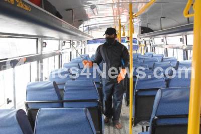 Event Description : A worker spray disinfectant on KSRTC bus at Kempegowda Bus stand, in Bengaluru on Monday 13th July 2020