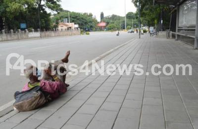 Photo Caption : A homeless man seen lying near Corporation circle, as Karnataka Government announced one week lockdown in Bengaluru City due to surge in COVID-19 Coronavirus cases, in Bengaluru on Wednesday 15th July 2020