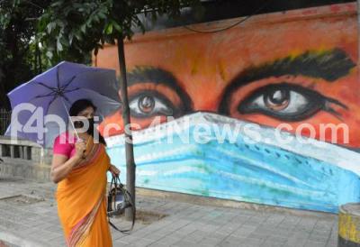 Photo Caption : A woman with umbrella seen walking past a huge wall painting on Coronavirus, as heavy rains lashed Bengaluru City during the extended Coronavirus Lockdown, in Bengaluru on Wednesday 15th July 2020