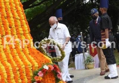 Photo Caption : Chief Minister of Karnataka BS Yediyurappa paying homage to commemorate Kargil Vijay Divas at the National Military Memorial, in Bengaluru on Sunday 26th July 2020