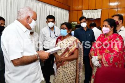 ASHA workers submitting a memorandum to CM BS Yediyurappa at CM home office Krishna, in Bengaluru on Tuesday 28th July 2020