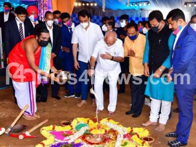 Chief Minister of Karnataka BS Yedyiurappa performing Bhoomi pooja for the Bengaluru Life Science Park at Electronic City, also seen are DCM Ashwath Narayan, MLA Krishnappa and others, in Bengaluru on Wednesday 29th July 2020