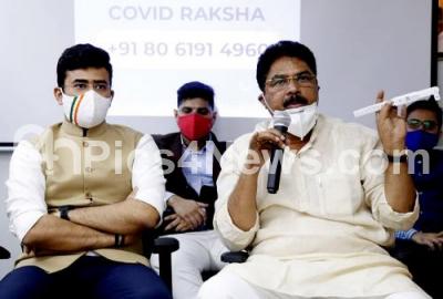 Photo Caption : Minister R Ashoka and MP Tejasvi Surya at the launch of COVID Raksha helpline, in Bengaluru on Friday 31st July 2020
