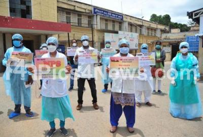 Event Description : Doctors and Nurses from Bowring and Lady Curzon Hospital Stage protest for various demands, in Bengaluru on Saturday 1st August 2020