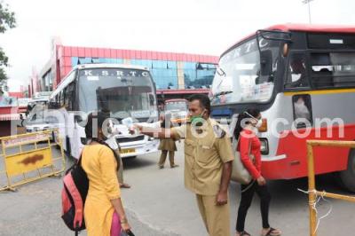 Photo Caption : KSRTC Personnel seen screening passengers for COVID as operations resume, in Mysore on Sunday 02nd August 2020