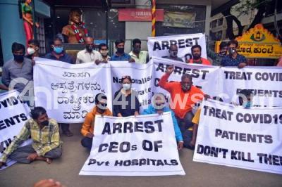 Photo Caption : Film Actor Sudharani with members of Bharati Nagar Residents Forum protesting against private hospitals and management for denying treatment of COVID-19 patients, in Bengaluru on Monday 03 August 2020