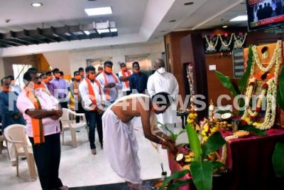 Photo Caption : BJP leaders and workers performing pooja to Sri Rama at BJP office on the Bhoomi Pujan day of Ayodhyas Ram Mandir, in Bengaluru on Wednesday 05th August 2020