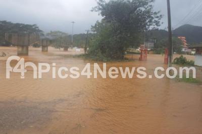 Photo Caption : Madikeri on High Alert due to incessant rain battering the district and the hinterland is disconnected due to disruption in transportation caused by overflowing rivers and rivulets and uprooted trees and electricity poles blocking roads, in Madikeri on Thursday 6th August 2020