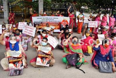 ASHA workers, mid-day meals workers and Anganavadi workers stage a protest against the State government for their various demands, in Bengaluru on Friday 07th August 2020