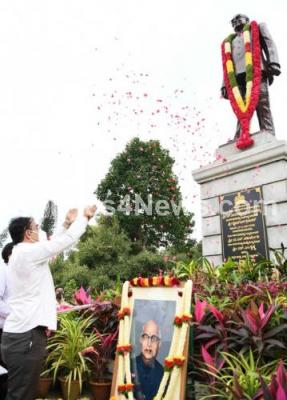 Photo Caption : DCM Ashwath Narayan and Chief Secretary TM Vijay Bhaskar paying floral tribute to the Former CM S Nijaligappa portrait during his death anniversary at Vidhana Soudha, in Bengaluru on Saturday 8th August 2020