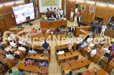 Photo Caption : Gautham Kumar Mayor BBMP, Deputy Mayor Ram Mohan Raju , Manjunath Prasad Commissioner BBMP along with other councilors seen at BBMP council meeting , in Bengaluru on Monday 10th August 2020