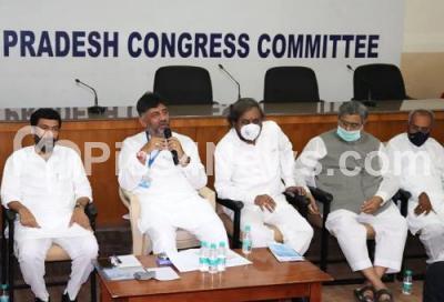 Photo Caption : KPCC President DK Sivakumar meeting with all District Congress Committee Chairmen, state chairmen of various sales / divisions, health handicrafts committee, health handling committee and disciplinary committee at KPCC office, also seen are Working Presidents Eshwar Khandre, Salim Ahmed, Dhruvanarayana, Chairman of Health Handicrafts Committee, Former Speaker KV Koliwada and others, in Bengaluru on Monday 10th August 2020