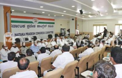 Photo Caption : KPCC President DK Sivakumar meeting with all District Congress Committee Chairmen, state chairmen of various sales / divisions, health handicrafts committee, health handling committee and disciplinary committee at KPCC office, also seen are Working Presidents Eshwar Khandre, Salim Ahmed, Dhruvanarayana, Chairman of Health Handicrafts Committee, Former Speaker KV Koliwada and others, in Bengaluru on Monday 10th August 2020