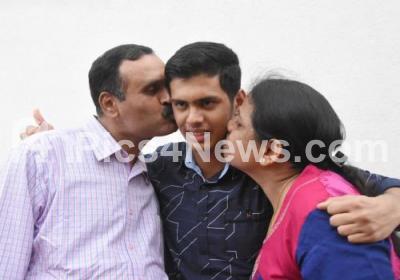Photo Caption : Chirayu KS St. Marys High School SSLC topper scored 625 seen congratulated by his parents after the SSLC results were announced today, in Bengaluru on Monday 10th August 2020