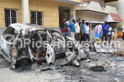 Photo Caption : People watch burnt vehicles after violence broke out overnight in Devara Jevana Halli and Kadugondanahalli area following a "derogatory" Facebook post, 3 people have been killed and many injured, in Bengaluru on Wednesday 12th August 2020
