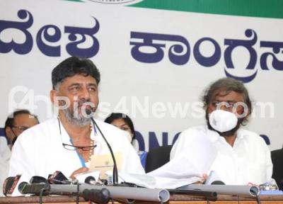 Photo Caption : KPCC President DK Shivakumar addressing a press conference at KPCC office also seen are Congress Leaders Eshwar Khandre and others, in Bengaluru on Wednesday 12th August 2020