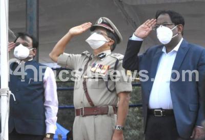 Photo Caption : Police Commissioner Kamal Panth with BBMP Commissioner Manjunath Prasad and GN Shivamurthy, DC, Bengaluru District saluting National flag during rehearsal parade ahead of Independence Day celebrations at Manekshaw Parade Grounds, in Bengaluru on Thursday 13th August 2020