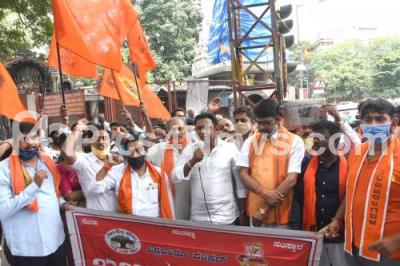 Members of Vishwahindu Parishath protesting against violence in Devara Jeevanahalli and Kadugondanahalli area, in Bengaluru on Thursday 13th August 2020