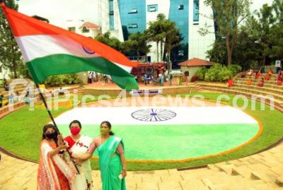 A 4000 sq ft Tricolor rangoli made by students and teachers of Sapthagiri Engineering College, as part of the 74th Independence Day celebrations, in Bengaluru on Friday 14th August 2020