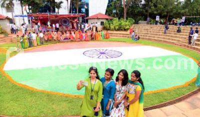 Photo Caption : A 4000 sq ft Tricolor rangoli made by students and teachers of Sapthagiri Engineering College, as part of the 74th Independence Day celebrations, in Bengaluru on Friday 14th August 2020