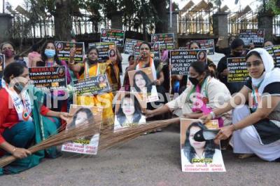Photo Caption : Members Congress stage protest against Meera Raghavendras alleged social media posts at Congress Bhavan , in Bengaluru on Monday 17th August 2020