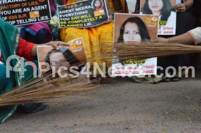 Event Description : Members Congress stage protest against Meera Raghavendras alleged social media posts at Congress Bhavan , in Bengaluru on Monday 17th August 2020
