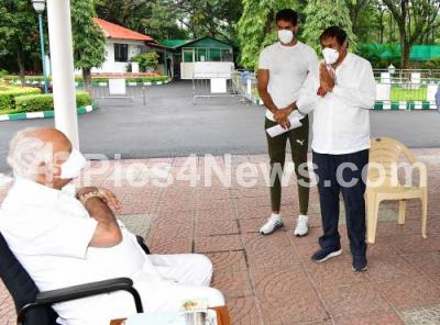 Photo Caption : Chief Minister of Karnataka BS Yeddiyurappa meets Congress party MLA Akhanda Srinivas Murthy, in Bengaluru on Monday 17th August 2020