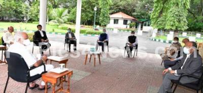 Photo Caption : Chief Minister of Karnataka BS Yediyurappa with Home Minister Basavaraj Bommai, Chief Secretary Vijay Bhaskar, DG and IGP Praveen Sood, Police Commissioner Kamal Panth, Advocate General Prabhulinga Navadagi during a meeting on DJ Halli riots , in Bengaluru on Monday 17th August 2020