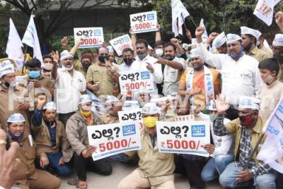 Members of Aam Aadmi Party and Taxi and Autorickshaw drivers protesting against BJP state government for not releasing Covid funds to auto and cab drivers, in Bengaluru on Wednesday 19th August 2020