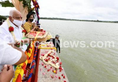 Photo Caption : Chief Minister of Karnataka BS Yeddiyurappa with MP Sumalatha offered Bagina to river Cauvery at KRS Dam, in Mysuru on Friday 21st August 2020