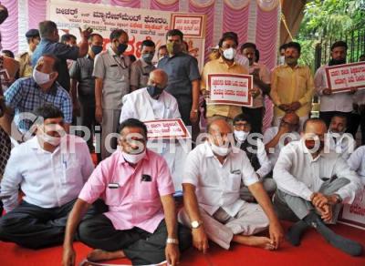 Photo Caption : JD S Supremo HD Devegowda with members of JDS stage protest for various demands at Maurya Circle, in Bengaluru on Wednesday 26th August 2020