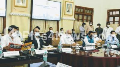 CM BS Yediurappa with Union Minister Prahlad Joshi, Ministers Jagadish Shettar, CC Patil , R Ashok, Chief Secretary TM Vijayabhaskar and others at high-level meeting on BGML land as Industrial area at Conference Hall, Vidhana Soudha, in Bengaluru on Friday 28th August 2020