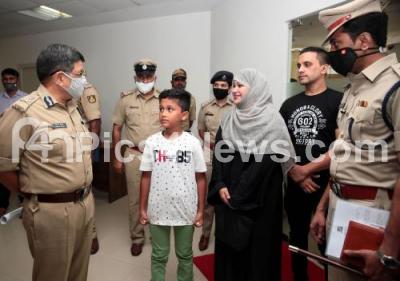 Photo Caption : Police Commissioner Kamal Pant interacting with parents and their 11year old son, a boy was kidnapped by Mohammed Zain and his team, the East Division police personnel arrested the kidnappers after 16hrs operation, in Bengaluru on Saturday 29th August 2020