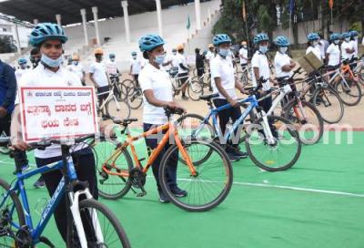 Photo Caption : Karnataka State Reserve Police personnel participated in Bicycle Jatha Rally program to raise awareness of life saving by donating plasma in public at Ashok Nagar Grounds, in Bengaluru on Sunday 30th August 2020