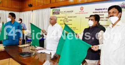 Chief Minister of Karnataka BS Yediyurappa with Suresh Angadi, Union Minister of State Railways, Ministers R Ashoka, Ramesh Jarkiholi and others flagged off for the maiden RO-RO service between Bengaluru (Nelamangala) to Solapur (Bale) through video link at home office Krishna, in Bengaluru on Sunday 30th August 2020