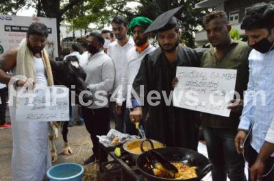 Youth Congress workers and leaders participated seen cooking in a unique protest against the central government during the flag march “ROZGAR DO” (Give Jobs) at Congress Bhavan, in Bengaluru on Thursday 3rd September 2020
