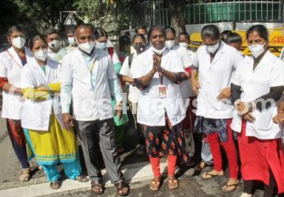 Photo Caption : Contract nurses protesting near CM Home office, Kumara Krupa road, demanding for permanent jobs, in Bengaluru on Thursday 3rd September 2020