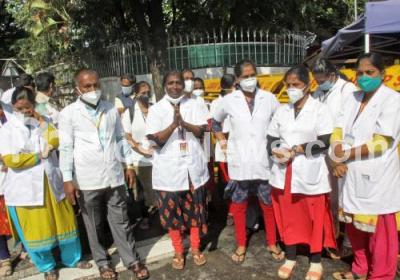 Photo Caption : Contract nurses protesting near CM Home office, Kumara Krupa road, demanding for permanent jobs, in Bengaluru on Thursday 3rd September 2020