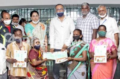 Photo Caption : MLA Dinesh Gundurao distributed Hakku Patra to the beneficiaries at MLA office, also seen are Councilor Latha Kumar Rathod and others, in Bengaluru on Friday 4th September 2020