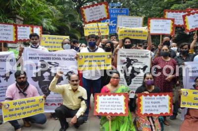 Event Description : Members of Associated Management of Primary and Secondary Schools in Karnataka Stage Protest for various demands at Shikshakara Sadan, in Bengaluru on Saturday 5th September 2020