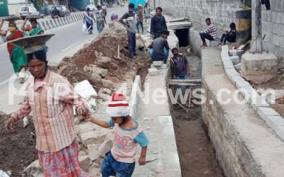 Photo Caption : A woman with her kid at a drainage work progress at Seshadripuram Road, in Bengaluru on Tuesday 15th September 2020