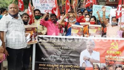 Members of CPI(M) protesting against Central government and Delhi police action to criminalize peaceful democratic protests, in Bengaluru on Tuesday 15th September 2020