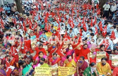 Photo Caption : Members of Centre of Indian Trade Unions staging dharna at freedom park to protest and demanding fulfill their various demands, in Bengaluru on Thursday 24th September 2020