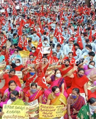Photo Caption : Members of Centre of Indian Trade Unions staging dharna at freedom park to protest and demanding fulfill their various demands, in Bengaluru on Thursday 24th September 2020