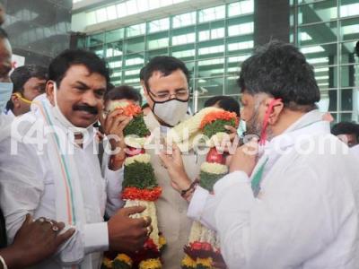 Photo Caption : Randeep Singh Surjewala, In-Charge of Karnataka and AICC General Secretary being welcomed by KPCC President D K Shivakumar at KIAL, in Bengaluru on Sunday 27th September 2020