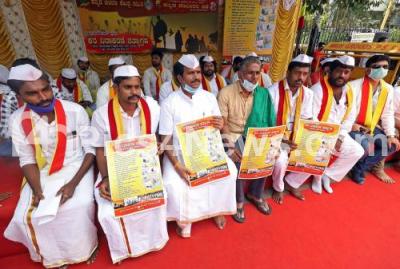 Photo Caption : Members of Kannada Ranadheera Pade stage protest for various demands at Maurya circle, in Bengaluru on Friday 2nd October 2020