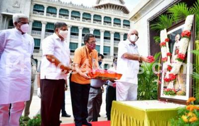 CM BS Yediyurappa offering floral tribute to Mahtama Gandhi and Lal Bahadur Shastri portraits at Vidhan Soudha, in Bengaluru on Friday 2nd October 2020