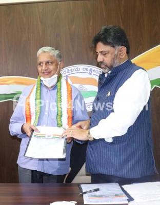 KPCC President D.K. Shivakumar distributed B form to Northeastern Teachers constituency Sharanappa Mattur and Bengaluru Teachers constituency to Praveen Peter, in Bengaluru on Sunday 4th October 2020