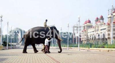 Photo Caption : Dasara elephants seen taking a stroll around Mysuru Palace ahead of Dasara Festival, in Mysuru on Monday 5th October 2020